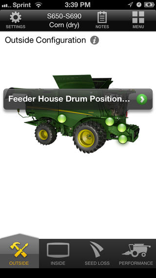 Harvest is just beginning in Central Illinois for some farmers and is very close for all others in the area. A tool I find very useful during the season, is one most people have on them at all times now, their smartphones. An app called GoHarvest can be downloaded on your device and can be put to good use while in the field with your John Deere Machine. The app is specifically designed to help with the new S-Series 650 through 690 machine models. It will help you set your machine correctly on the outside as well as on the inside with a very user friendly interface. The app can also be used to get the best performance out of your machine while in the field through the performance tab. You simply tell the app where your losses or problem is with the harvested grain and it will supply you with an adjustment to try and improve the existing problem. It will even ask you if this adjustment corrected the problem and give you a checklist for common issues associated with the complaint. You can also make notes right on the app if there is something you want to remember from year to year.