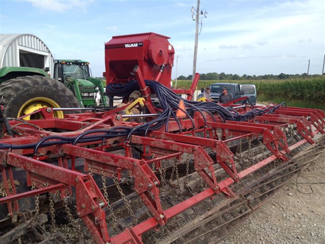 One thing starting to make an impact in our area is cover cropping. Guys are seeing cleaner fields in the spring that are free from weeds, and in the process they are boosting organic matter in the soil. Currently there aren’t many options for planting your cover crops. You can fly it on with an airplane or you can make 2 passes, first with the tillage tool and next with the seeder. Cost is a concern for both of these methods. Broadcasting during fertilizer application is an option, but stand quality can be an issue because of poor seed to soil contact.