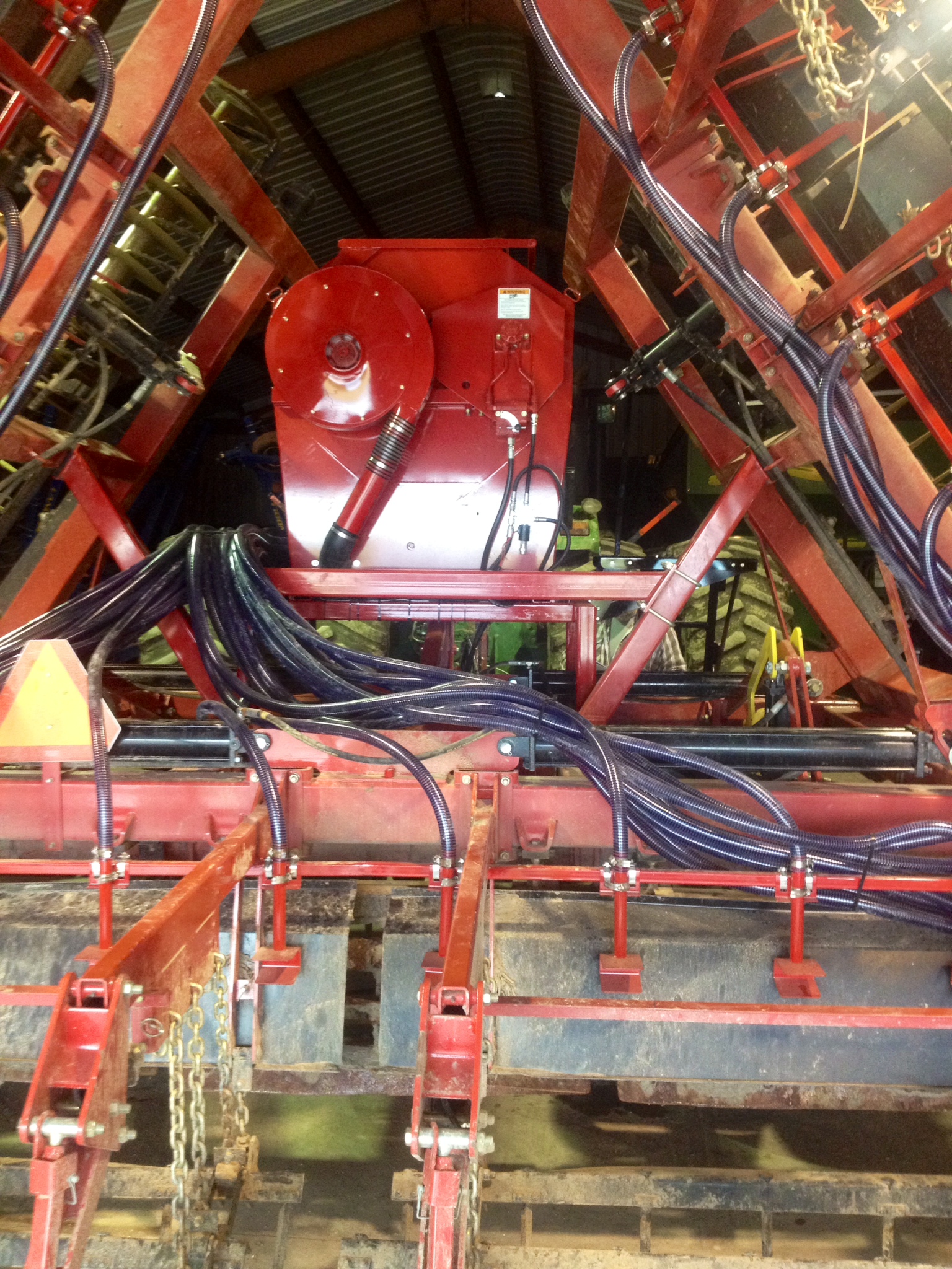 The seed tubes run directly in front of the rolling basket harrow so the seed can get the proper seed to soil contact.