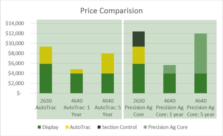 This month, John Deere introduced the new 4640 universal display. The 4640 display incorporates the easy-to-use layout of the 4600 Command Center and the portability of the GreenStar 2630.  With the release of the new 4640 display,  John Deere has moved to a subscription based activation system which is different from the previous approach of a one-time activation purchase.  Now activations for the 4640 are offered in four different configurations shown below: